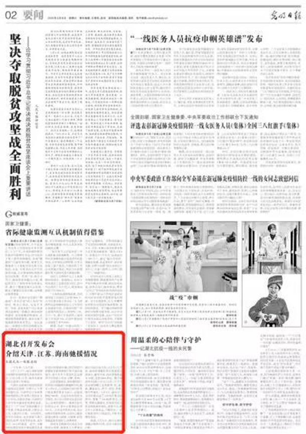 《光明日报》刊发文章《湖北召开发布会 介绍天津、江苏、海南驰援情况》,文章说,天津医疗队在救治方面,推出“前后方联动,及时会诊,24小时连线”;“引入微医互联网医院,为老百姓网上咨询、诊断、看病”等新方式。