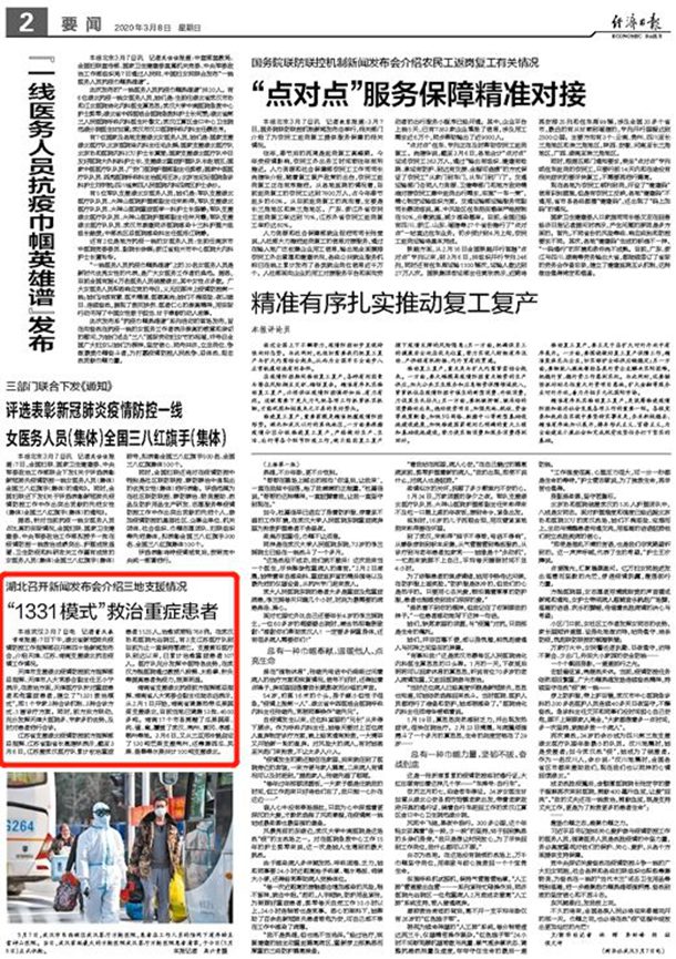 《经济日报》刊发文章《“1331模式”救治重症患者》,报道天津医疗队“1个专家3种会诊机制、3种会诊方式、1套诊疗方案”,救治重症和危重症患者。