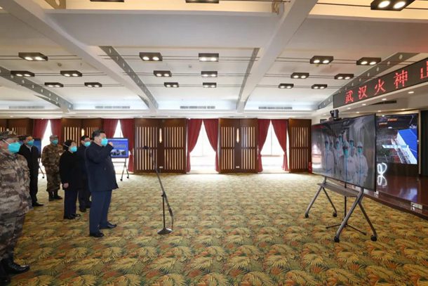 在火神山医院指挥中心,习近平听取医院建设运行、患者收治、医务人员防护保障、科研攻关等情况介绍。习近平指出,疫情发生以来,包括军队在内的广大医务工作者发扬特别能吃苦、特别能战斗的精神,义无反顾奔赴湖北和武汉,毫无畏惧投入防控救治工作,日夜奋战,舍生忘死,不负重托,不辱使命,同时间赛跑,与病魔较量,为武汉疫情防控工作作出了重要贡献。军队医务人员牢记我军宗旨,召之即来,来之能战,战之能胜,为党旗、军旗增添了光彩。沧海横流,方显英雄本色。你们真正做到了救死扶伤、大爱无疆。你们是光明的使者、希望的使者,是最美的天使,是真正的英雄!党和人民感谢你们!