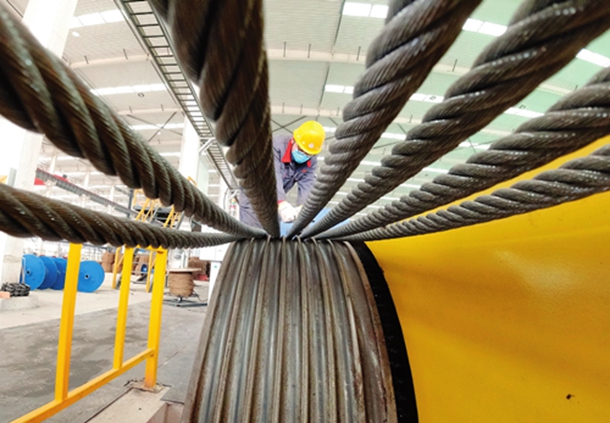 3月7日,工人在唐山海港经济开发区一家钢缆生产企业生产线上工作