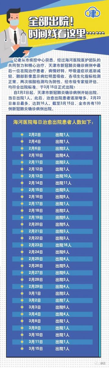 记者从市疾控中心获悉,经过海河医院医护团队的共同努力和精心治疗,天津市新冠肺炎确诊病例中最后一位在院治疗患者,病情好转,呼吸道症状逐渐减轻,肺部影像显示病灶明显吸收,各项生化指标检测正常,两次核酸检测均为阴性,经市级专家组评估,均符合出院标准,于3月15日正式出院!