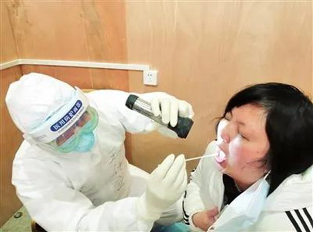 王仲言打开手电筒,再次尝试把咽拭子往陈先生的喉咙伸去。“哇──”陈先生又呕吐起来。王仲言让护士端来一杯水:“您漱漱口,咱们再来一次。”陈先生把椅子往墙壁上靠,身子抵紧椅背,努力张大嘴巴。“对,就这样,啊──好,成功了!谢谢您。”王仲言把取出的核酸样本迅速装进一支试管,封装、消毒,放置在样品箱里。这时,50多岁的陈先生快哭出声来了:“这是怎么说的!我没有感谢您,您倒谢谢起我来了。”