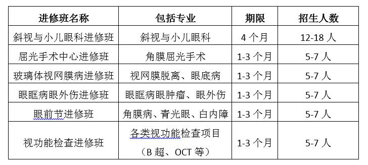 天津市眼科医院以规范化的带教模式和丰富的执教经验为进修医师的业务成长提供平台。现将我院眼科各专业的进修班介绍如下: