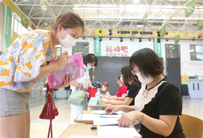 “家长您好,请您先扫描‘津门战疫’微信码,然后出示一下您的预约凭证……”在老师的引导下,王琦进入馆内。她按照要求首先提交了自己打印好的新生登记表。随后,又提交了居民户口簿、合法固定居所的证明、儿童预防接种证。两组老师完成了两轮详细查验后,王琦收到了报名完成的通知单。在扫描E校通二维码,关注、绑定手机号后,报名结束了。从扫码进入到完成报名走出体育馆,全程只用了4分钟。“提前在网上进行了孩子信息的登记,又预约了报名时间,但还是没想到能这么顺利。老师说,如果没问题的话,8月1日就可以到校领取入学通知书了。”出了校门后,王琦兴奋地说。