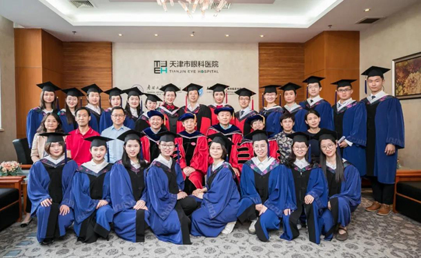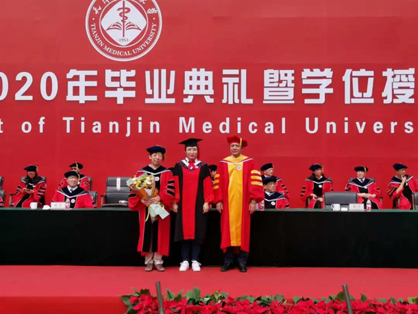 天津医科大学博士研究生李玥同学(中)、天津市眼科医院博士生导师王雁教授(左)与天津医科大学校长颜华教授(右)在天津医科大学2020年毕业典礼现场合影