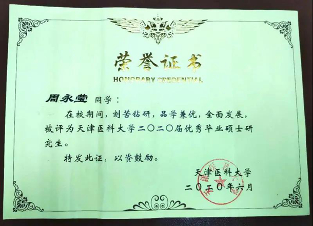 周永莹(导师:李轩教授)获得天津医科大学“2020届优秀毕业硕士研究生”荣誉称号