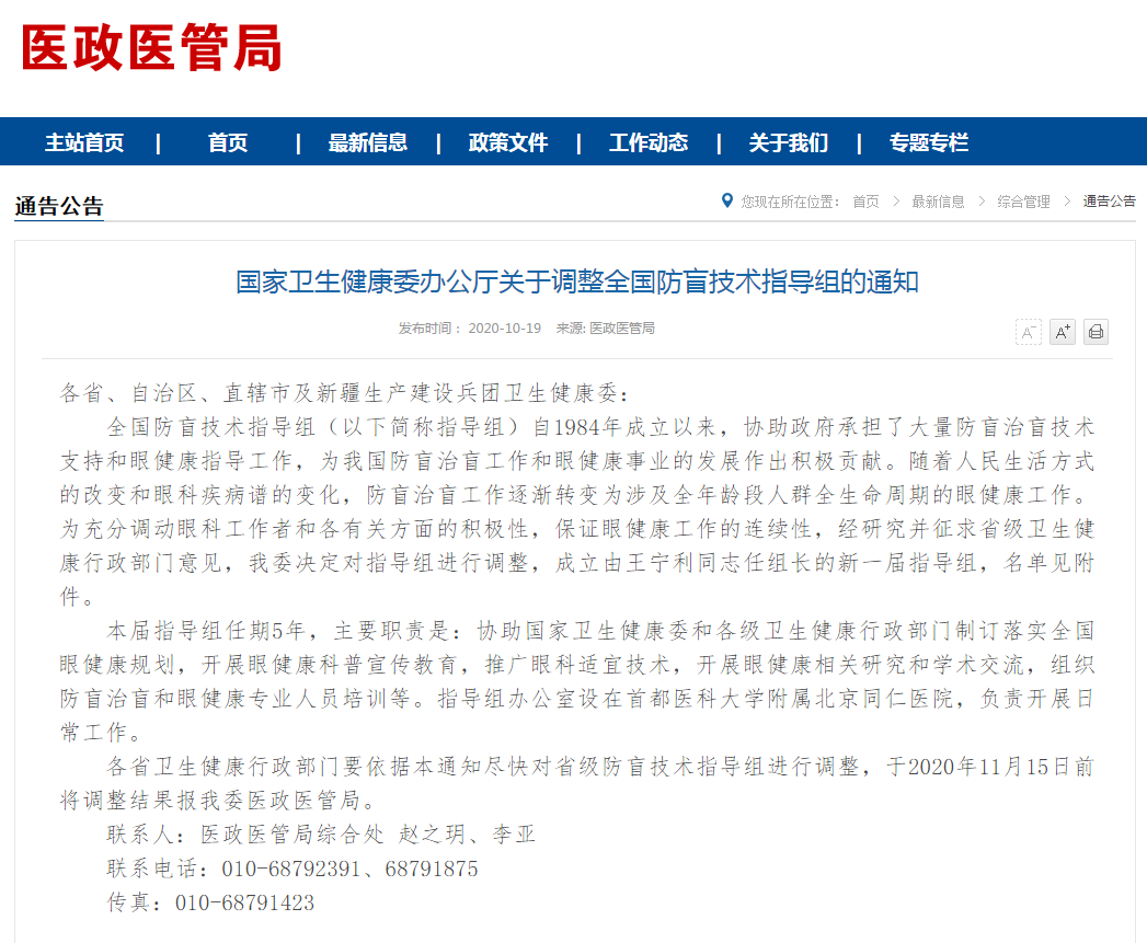 日前,国家卫生健康委办公厅发布《关于调整全国防盲技术指导组的通知》,中华医学会眼科学分会前任主任委员、中国医师协会眼科医师分会荣誉会长、我院老院长赵堪兴教授继续担任全国防盲技术指导组(以下简称指导组)顾问。中华医学会眼科学分会委员、眼视光学组副组长,中国医师协会眼科医师分会屈光手术专业委员会主任委员,我院王雁教授任指导组副组长。同时,王雁教授还兼任天津市防盲技术指导组组长,天津市眼科医院为天津市防盲技术指导组组长单位。
