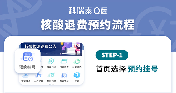 为方便您办理核酸退费,避免人员聚集,我院已开通科瑞泰Q医手机APP预约功能,预约流程如图,请您预约成功后,在急诊出口外面自助机取号,在核酸收费窗口办理退费。(已经医保联网结算的患者及陪护人员,我院在医保局出台相关退费政策后,开始医保退费,具体时间另行通知)