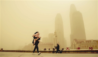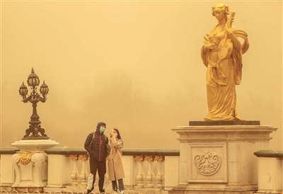 3月15日,我市出现沙尘天气。图为市民在北安桥驻足拍摄。 本组图片 本报记者 吴迪 摄