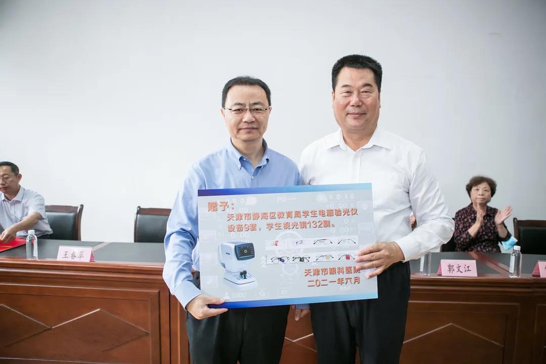 仪式上,王春革书记向静海区中小学校捐赠了视力筛查设备、视光中心主任李丽华向困难学生代表赠送了眼镜。