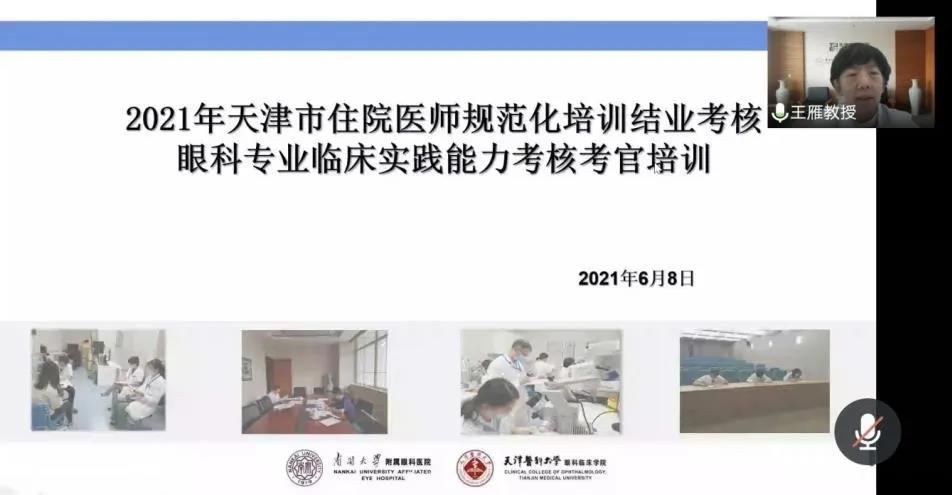 6月8日,组织了参加考核的考官线上培训,天津市眼科医院院长、天津市毕业后医学教学眼科学质控专家组组长王雁亲自培训,向考官明确结业考核的内容、流程、评分要点、注意事项、考试纪律等要求。