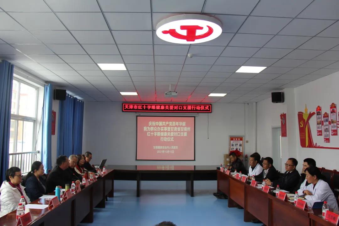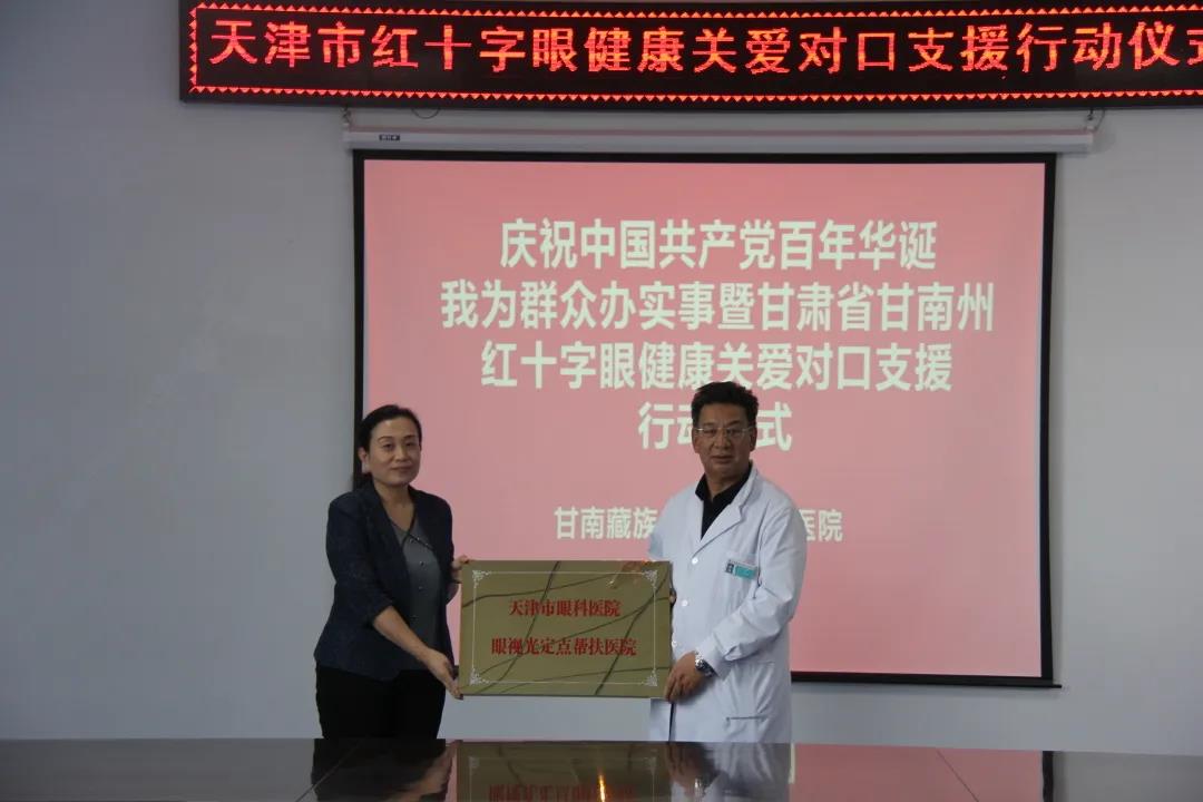 钟艳颖书记代表医院专家团队出席了甘南州医院“红十字眼健康关爱对口支援行动”启动仪式。会上,甘南州人民政府领导、州红十字会、州医院领导分别就历年来协同我院开展的帮扶工作成绩以及未来双方深度的合作前景与钟艳颖书记进行了交流。钟艳颖书记代表医院授牌将甘南州医院纳入我院眼视光定点帮扶医院。同时,我院还与天津市慈善协会合作捐赠了角膜地形图仪一台,并协调爱心企业捐赠眼科耗材。