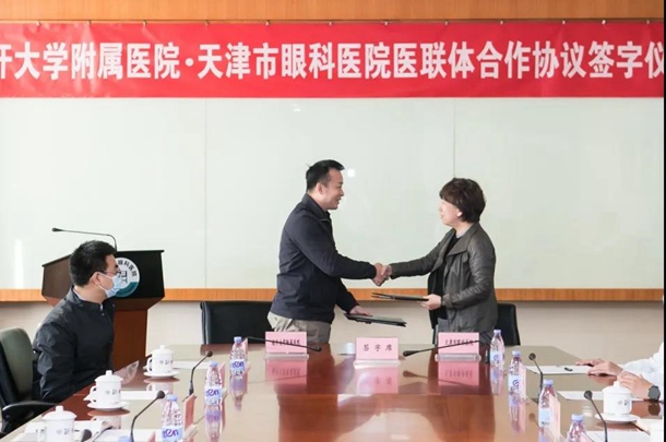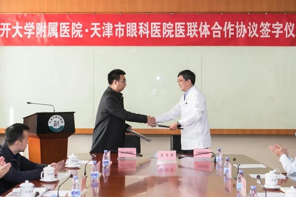 随后,王雁院长代表医院与南开大学附属医院(天津市第四医院)于新航副院长共同签署了医联体合作协议。我院视光中心张威副经理与南开大学附属医院(天津市第四医院)医政科张小青科长共同签署了眼视光合作协议。