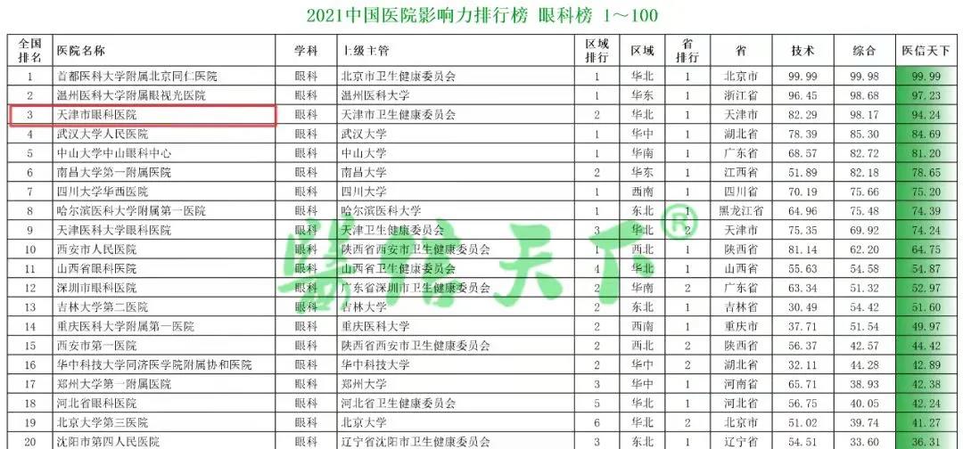 天津市眼科医院在2021中国医院影响力排行榜(眼科榜)位列第三名。