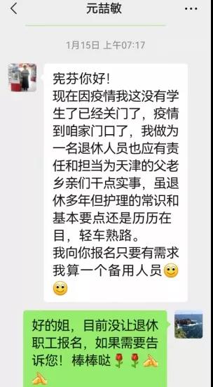 我院退休职工元喆敏老师,在这次疫情期间主动向医院报备,要求参与到疫情防控工作中去。