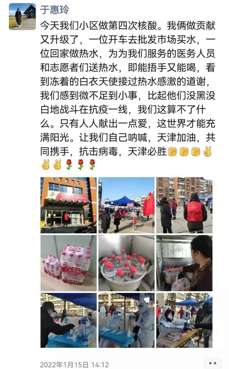 我院退休职工于惠玲老师也是一位特别热心的老党员,在这次抗疫行动中,和爱人一起为社区志愿者和核酸采集人员先是送去了温暖的热水瓶暖手,之后又购买多箱矿泉水,加热后送到每个工作人员手中。