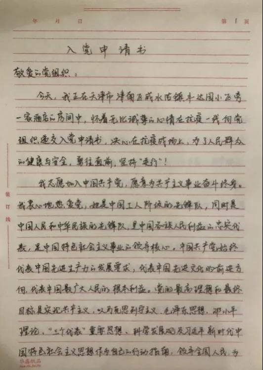 13日凌晨4点,二组还没有完成任务。因为他们需要入户采集,并且有严格居家隔离者。刚来津南就遇到这么高风险的任务,我陷入了激烈的思想斗争,院领导再三嘱咐我要把队员安全的带回去,万一有职业暴露,万一有感染,万一……,若干个万一从头脑中涌现、聚集。这时王霞医生打来了电话,虽有担忧,但绝对不畏战。当天任务结束后,王霞医生就提交了庄严的入党申请书。