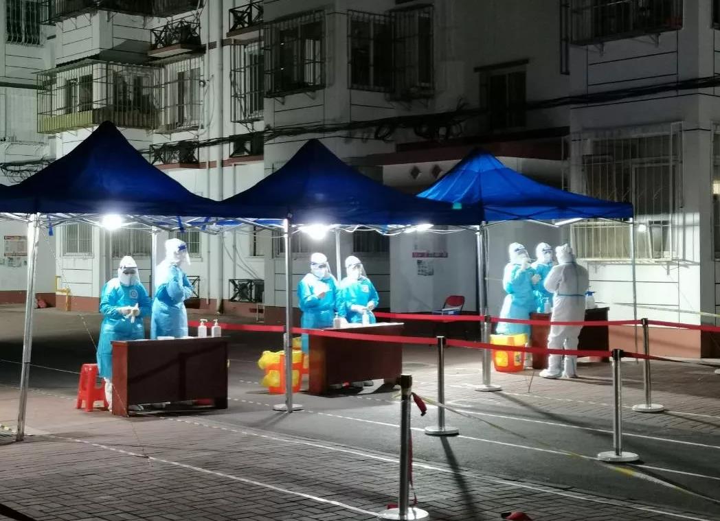 19:30,在东旺家园封控区,共完成核酸筛查1549例,入户23户。7级大风,午夜寒冷,物资条件有限。为了减少居民们的聚集、提高居民们的采样体验,志愿者和队员们商量后决定在居民楼门外15米处进行核酸检测,这样缩短了居民们的等候时间。1月13日凌晨3:00,结束任务,收工。