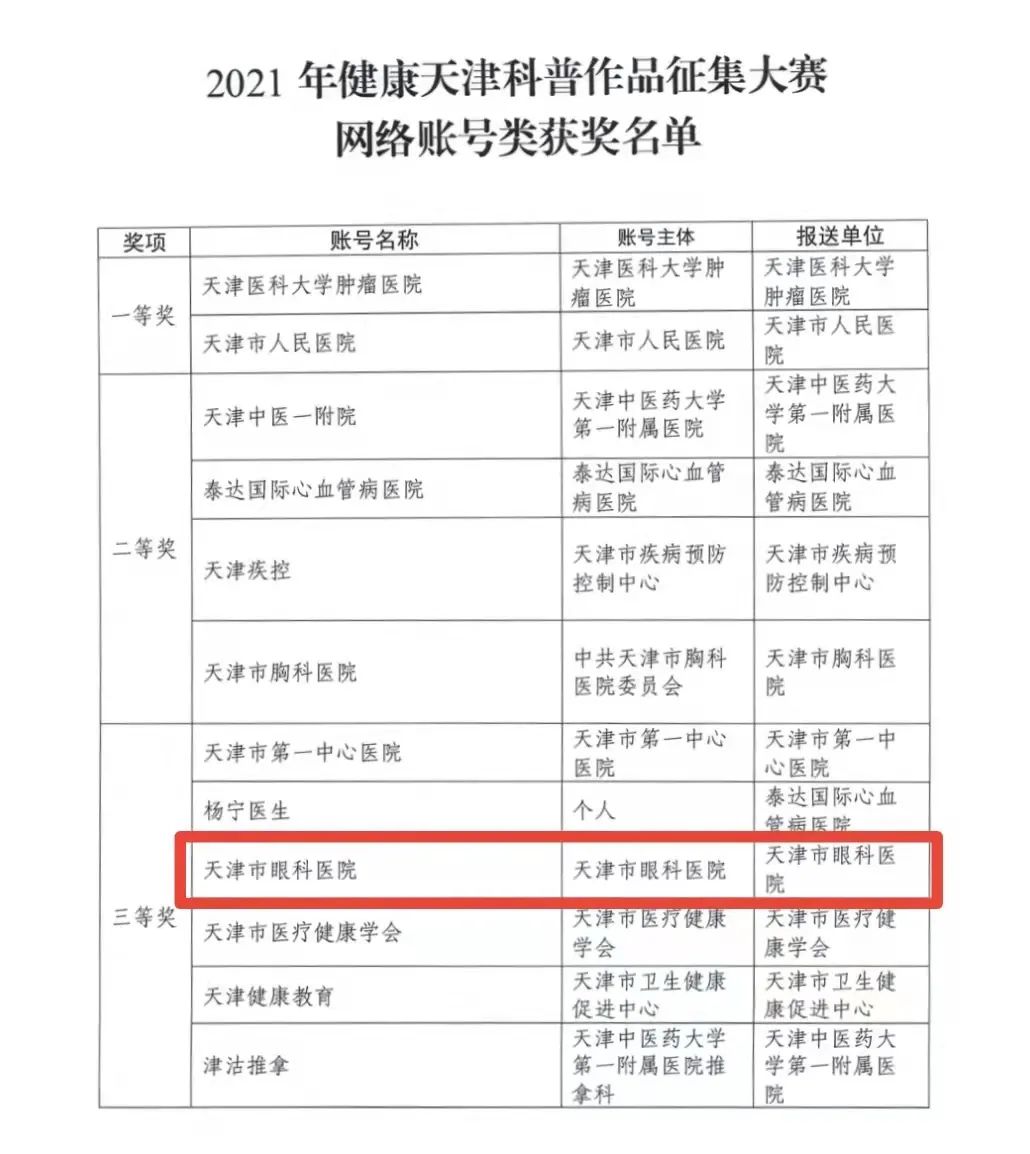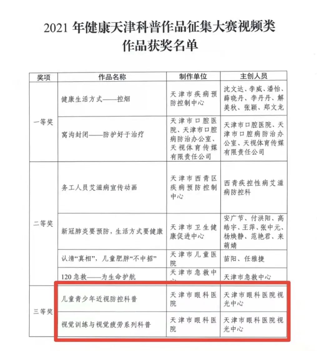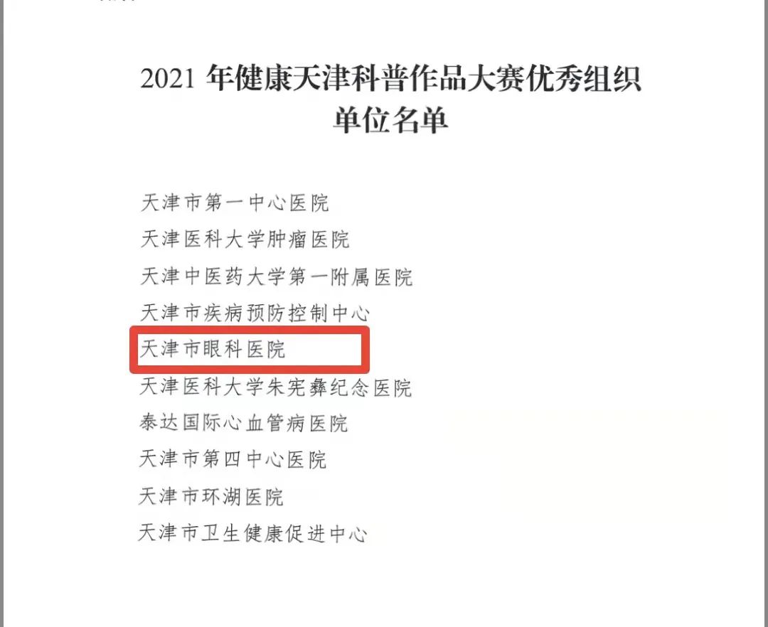 天津市眼科医院在2021年健康天津科普作品征集大赛中被授予“优秀组织单位”奖;天津市眼科医院微信公众号荣获网络账号类三等奖;由视光中心创作《儿童青少年近视防控科普》、《视觉训练与视觉疲劳系列科普》荣获视频类作品三等奖。