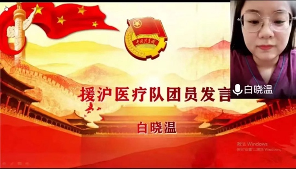 援沪医疗队临时党支部书记王琦妙发言。她详细介绍了医疗队工作、队员思想状态以及团员青年作用发挥等情况。她向参加此次线上交流活动的同事表示感谢,大家对医疗队的关心和支持令队员们倍感温暖,医疗队必将凝心聚力、攻坚克难,坚决打赢上海疫情防控阻击战这场大仗硬仗,早日与大家团聚。