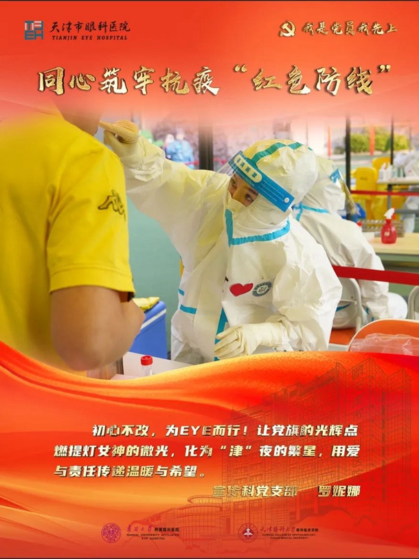 在当前天津严峻的疫情防控形势下,天津市眼科医院党委始终把疫情防控作为当前最重要、最紧迫的政治任务,把党史学习教育成果转化为疫情防控和服务群众的强大动力,构筑起一道道严密的“红色防线”,在战疫一线践行初心使命和责任担当。