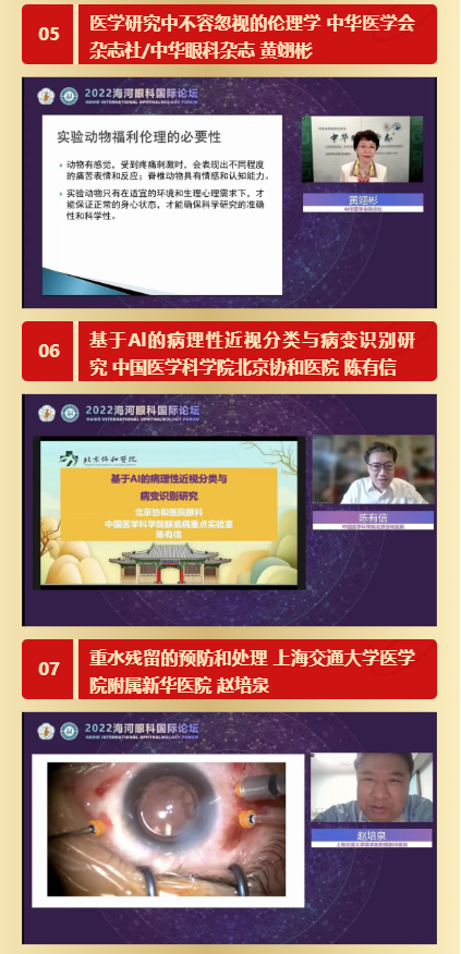 在第一时段上海交通大学附属第一人民医院许迅教授详细介绍了近视眼轴增长对眼部病变的关系,山东省眼科医院史伟云教授为大家带来了角膜皮样瘤的诊断、手术方式的选择以及典型病例的介绍,首都医科大学附属北京同仁医院魏文斌教授就人工智能在近视防控领域的应用示范进行了详尽的讲解,中国人民解放军总医院李朝辉教授对关于白内障患者人工晶体公式的选择做了详细的介绍,来自中华医学会杂志社黄翊彬教授为大家介绍了医学研究及论文发表时应注意的伦理学问题,中国医学科学院北京协和医院陈有信教授对病理性近视导致的不同眼底病变的AI识别方法的前沿研究进行了介绍,上海交通大学医学院附属新华医院赵培泉教授列举了典型重水残留的病例并对其预防与处理方法进行了汇报,天津市眼科医院张伟教授为纪念赫雨时教授开创和发展我国斜视事业,给大家带来赫雨时教授纪念专题讲座以及斜视相关的神经眼科学问题。