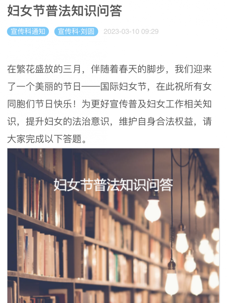 在线上开展妇女权益保护法律科普图解、问卷考试,引导全院广大职工学法、知法、用法、守法,尊重提高妇女地位,切实提高女性依法维护自身权益的意识和能力,促进家庭和谐和社会稳定。