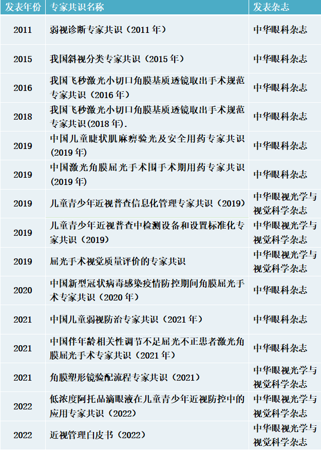 为持续推进“十四五”国家卫健委提出“国民眼健康计划”,市眼科医院紧跟国家政策,紧抓历史机遇,以科技制度改革为动力,科技服务临床为落脚点,在高质量的学术论文、科技成果奖、学术平台和成果转化、学术任职等方面不断取得突破。近十年间,由我院牵头或起草执笔,联合国内相关领域专家共同制定“专家共识”共15项,涉及斜视与小儿眼科,角膜与屈光手术,眼视光学,屈光矫正及近视防控等领域。各相关领域共识的发表对该领域的诊疗标准、治疗方法、药物使用等问题进行规范和统一。以下是我院十年来牵头或起草执笔的“专家共识”(按发布时间排序):
