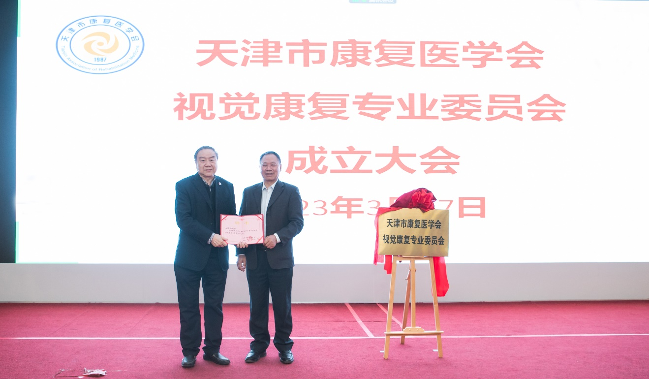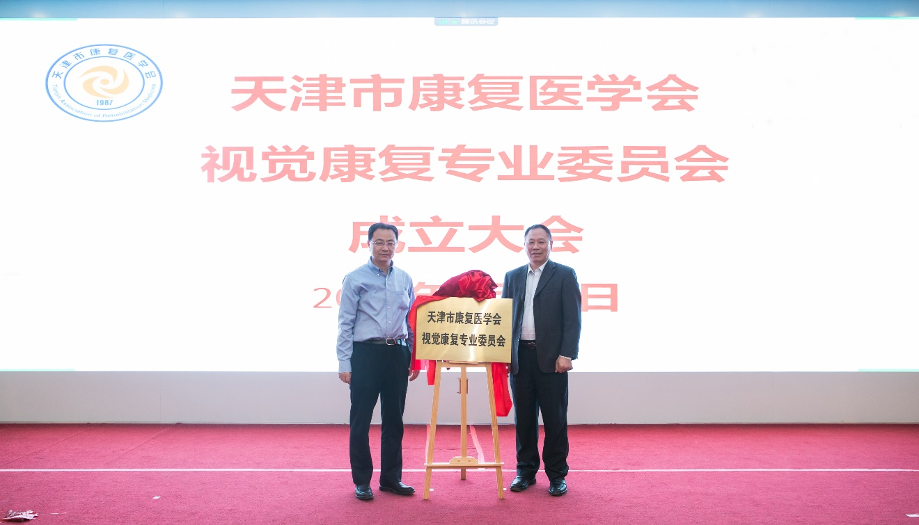 天津市康复医学会杜金刚会长和天津市眼科医院王春革书记为天津市康复医学会视觉康复专业委员会揭牌。
