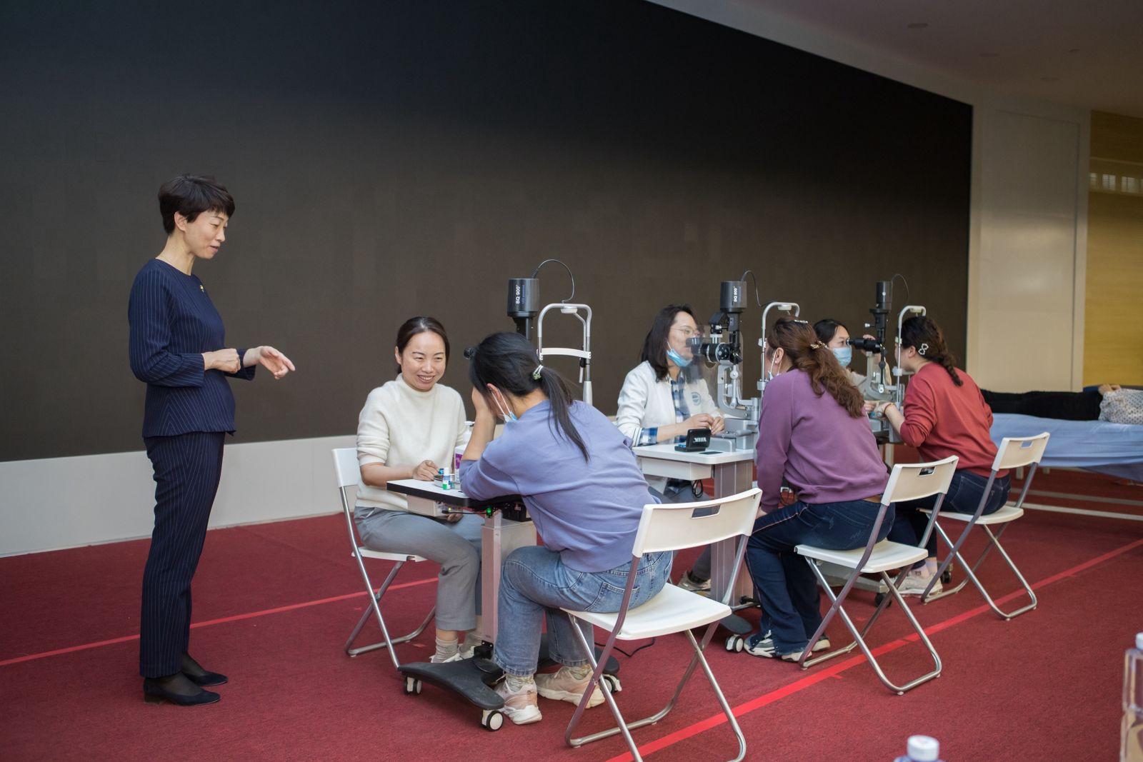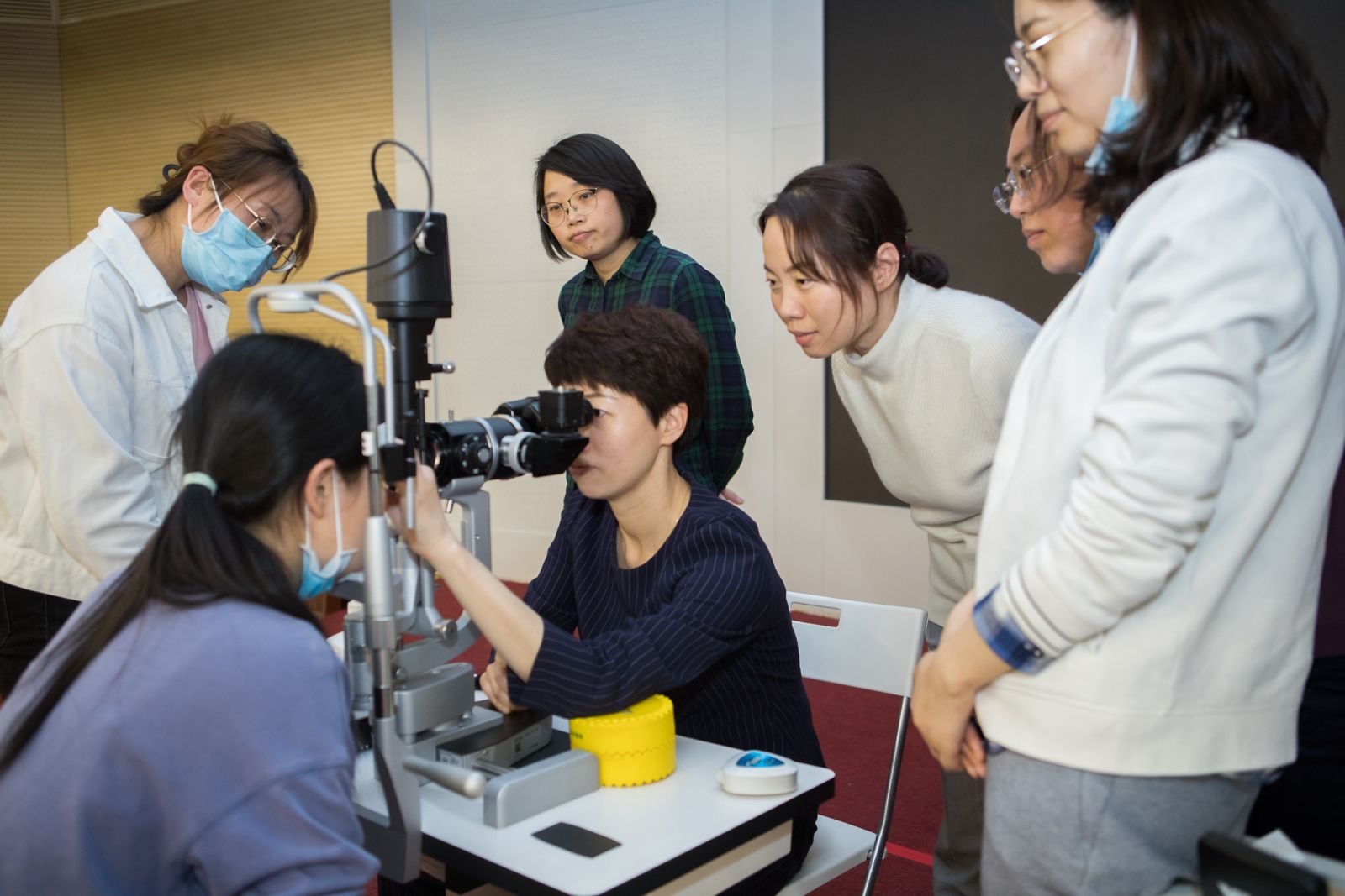 下午时段特别设立实操环节。间接检眼镜及裂隙灯前置镜训练采用真人实操学习模式,学员互相轮换进行检查训练。同时,老师使用多媒体设备进行实时操作演示,促进学员切实掌握检查和眼底绘图技巧。现场学习氛围浓厚,学员们踊跃实践。其中,双目间接检眼镜模拟器训练受到学员们的喜爱。