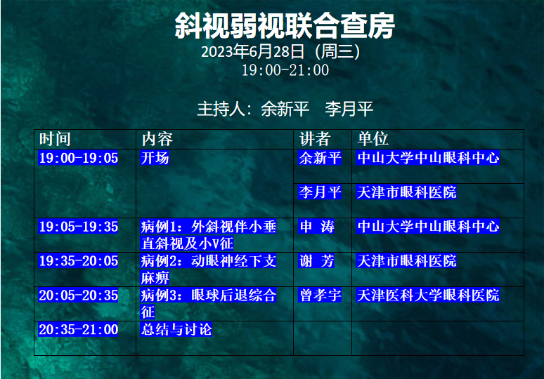 由天津市眼科医院与中山大学中山眼科中心联合主办的斜视弱视联合查房于2023年6月28日线上成功举办。本期联合查房聚焦水平斜视合并垂直斜视,由天津市眼科医院、中山大学中山眼科中心、天津医科大学眼科医院联袂分享病例以及诊疗心得。会议由天津市眼科医院斜视与小儿眼科李月平主任以及中山大学眼科中心余新平主任主持,会议邀请张伟教授、颜建华教授、钱学瀚教授共同参与病例讨论并做病例点评。