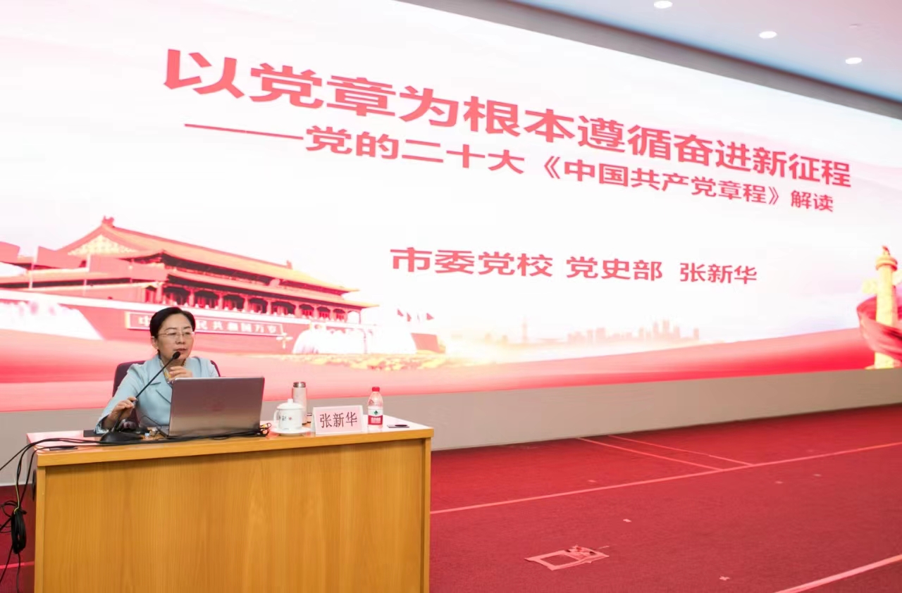张新华教授从党章的概述切入,以历史的维度梳理了党的二大以来党章进行的十八次修订修改过程,从为什么要修改、修改了哪些内容条款、体现了什么时代价值等方面,进行了深入浅出的解读与阐释,着重对党的二十大通过的党章修正案的修改背景、修改原则、修改要求、修改内容进行了讲解,谈了自己学习党的二十大通过的党章修正案的体会,并对在实际工作中如何更好地学习贯彻新党章提出了建议。