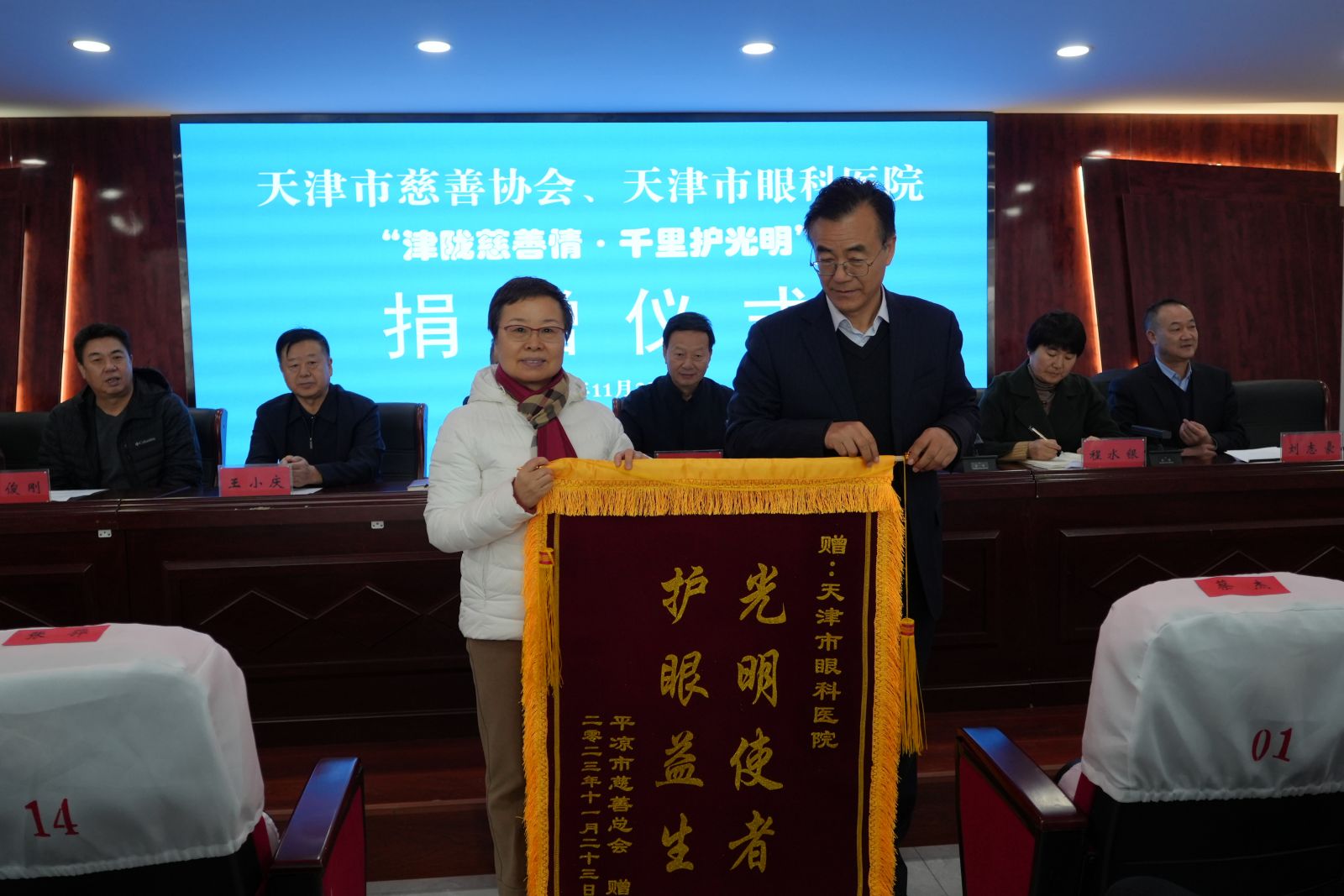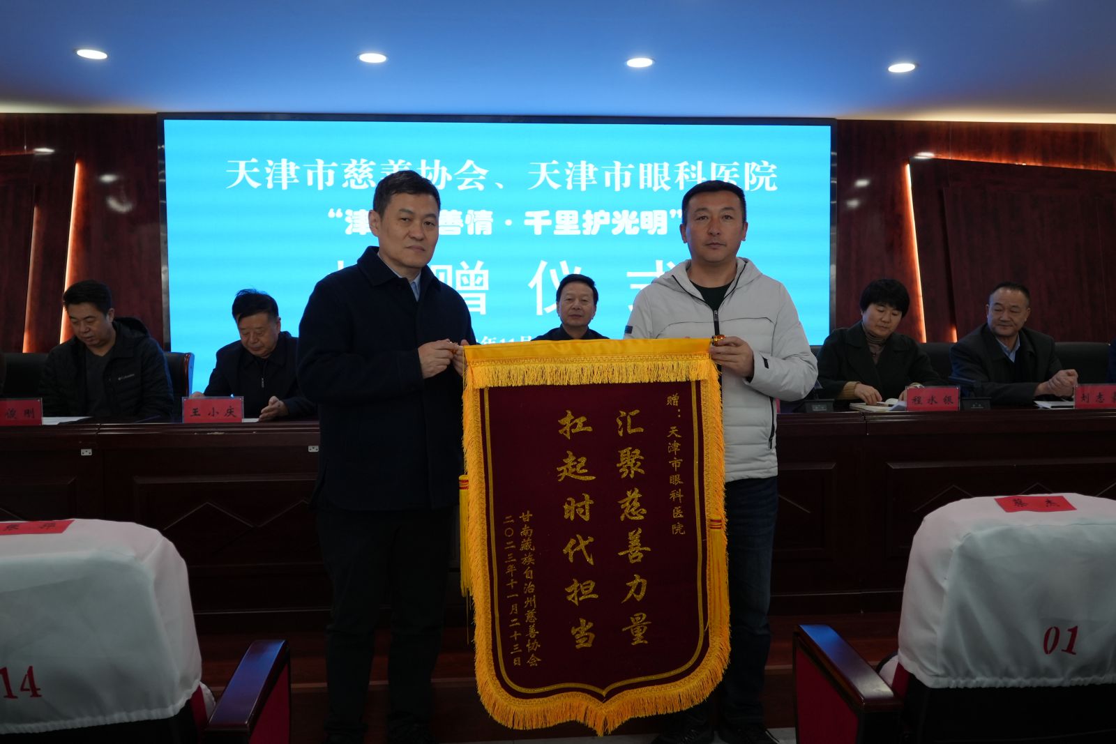 甘南州慈善会综合科科长李公保,平凉市慈善会副会长吴宗,庆阳市社会救助中心主任、市慈善会常务副会长刘志豪分别代表所在单位接受了天津市眼科医院的捐赠,并回赠锦旗表达谢意。同时,庆阳市慈善会常务副会长刘志豪发表致辞,着重强调了慈善的力量和社会的责任感,传递了津陇慈善情的真谛。