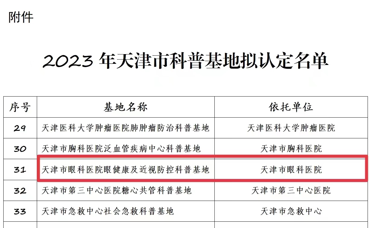 11月20日,经材料评审、集中答辩、实地勘察、部门评议等程序,天津市科技局公布了2023年天津市科普基地拟认定名单,天津市眼科医院眼健康及近视防控科普基地成功入选。