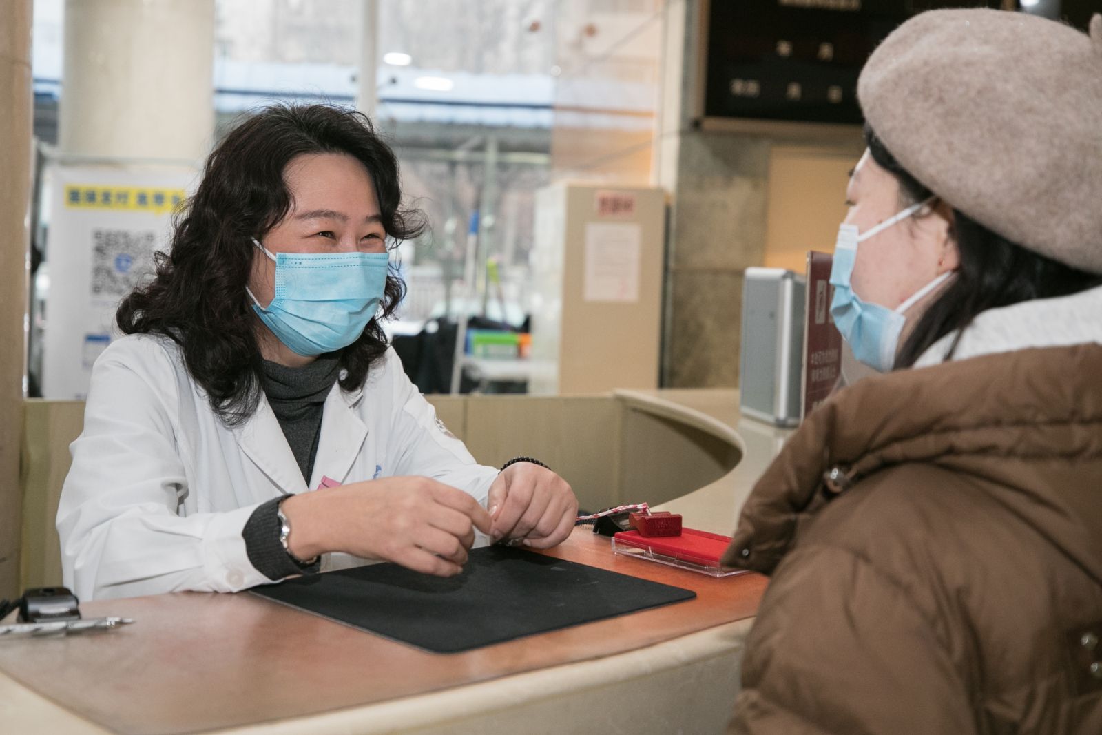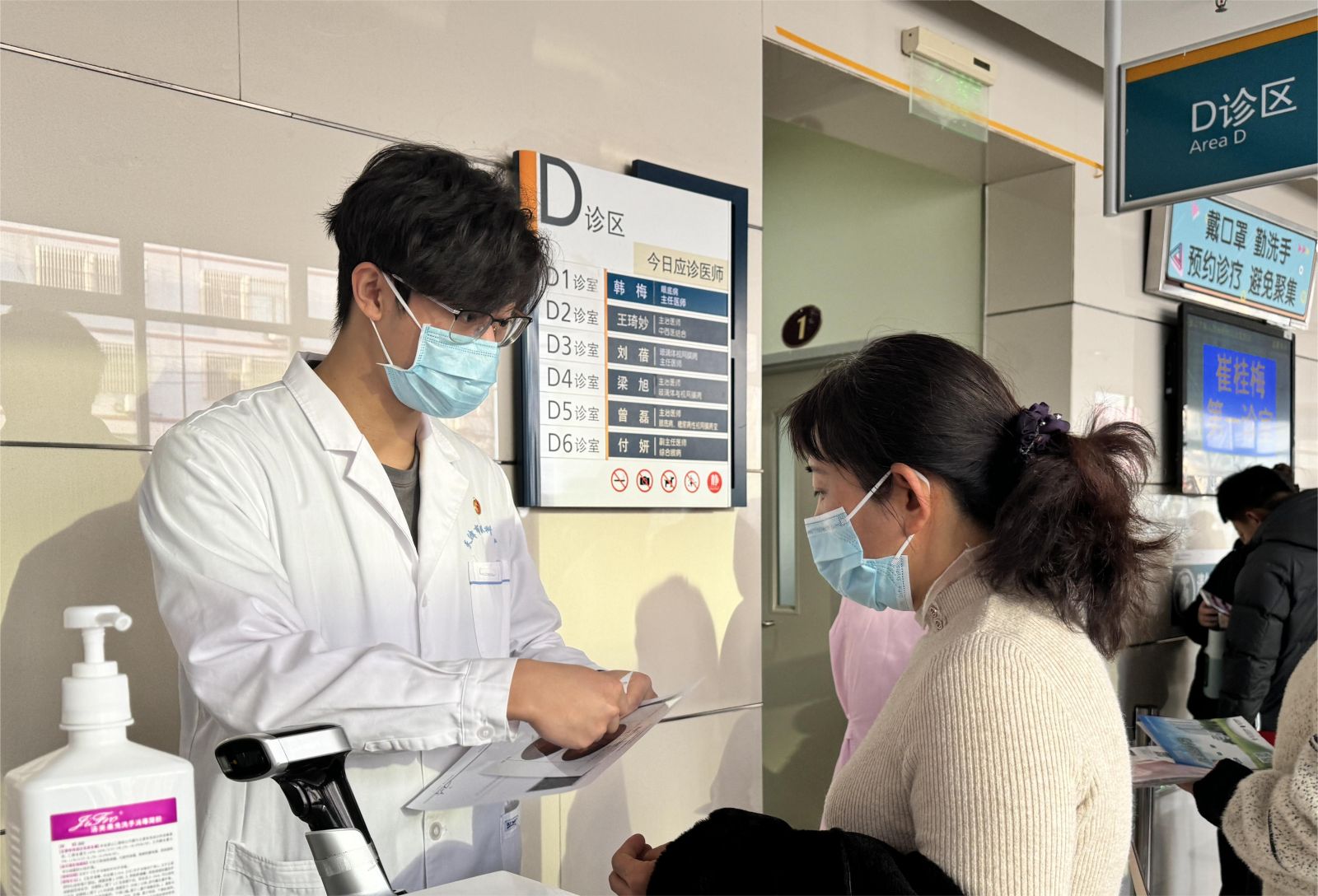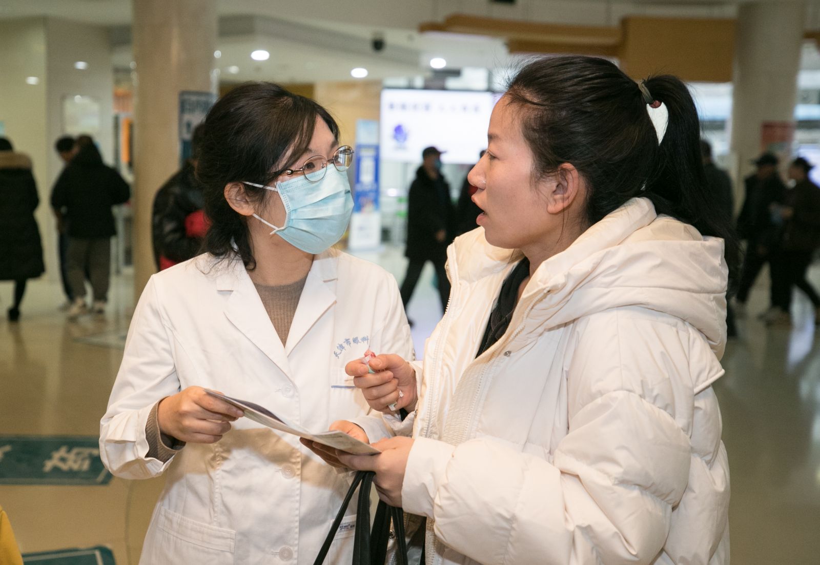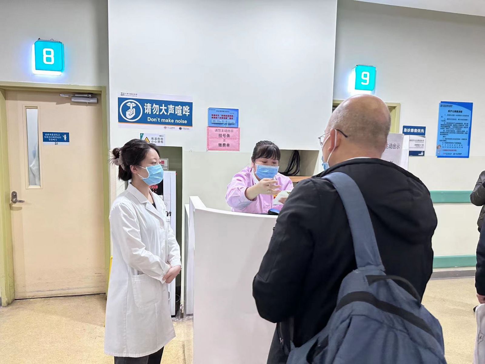 工作人员在二楼诊区引导患者就医,向患者进一步解释就医流程。