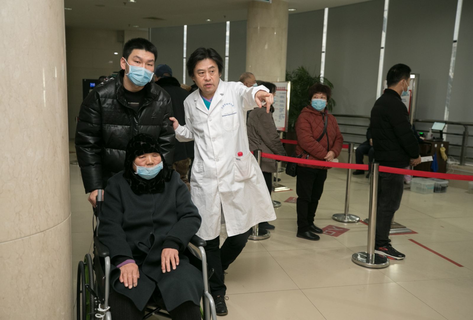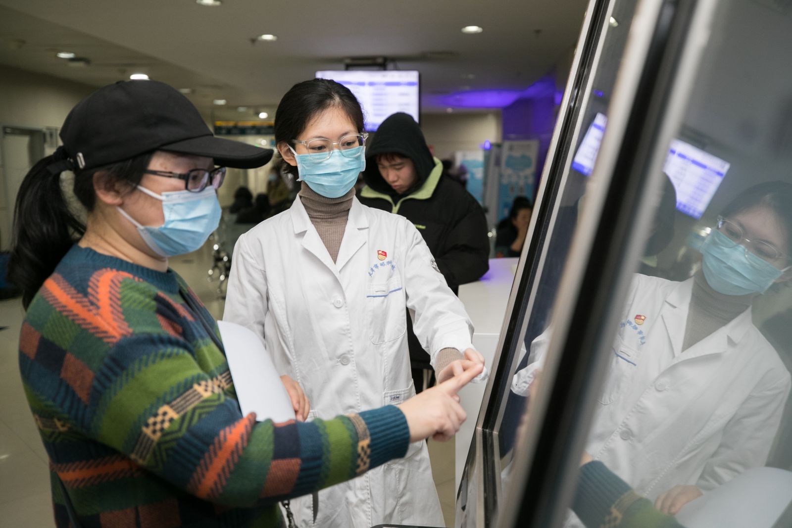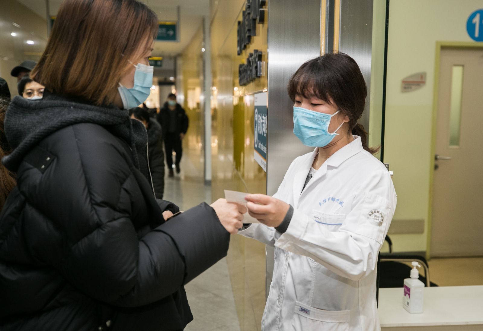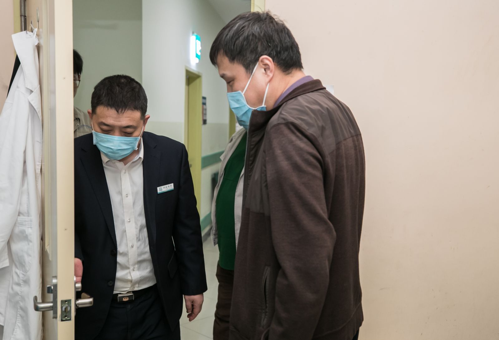 工作人员在二楼诊区引导患者就医,向患者进一步解释就医流程。