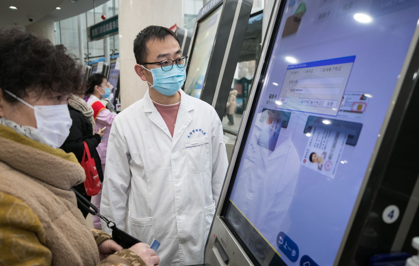 工作人员帮助患者查看排号进程,引导患者及时就医。