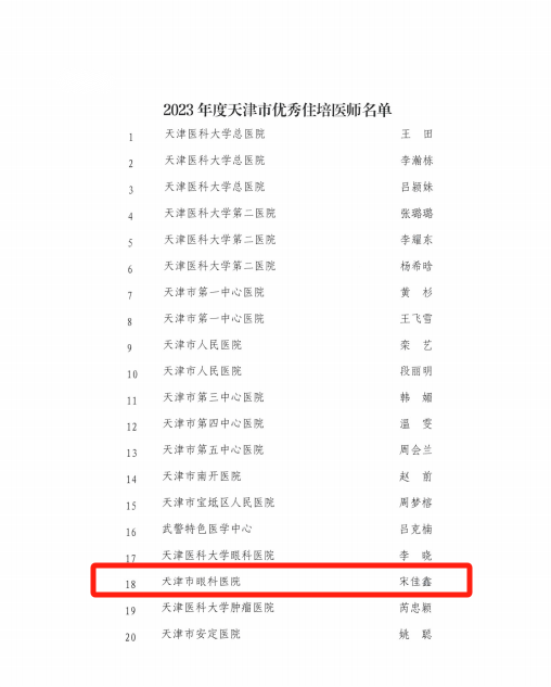 宋佳鑫,天津医科大学2021级专业型硕士,导师王雁教授。在规培即将结束之际,非常荣幸被评选为“天津市优秀住培学员”,感谢天津市眼科医院每一位老师对我的耐心指导。在过去的三年间,老师们的指引,同事们的鼓励,都历历在目。在未来的工作与学习中,我一定不忘初心,砥砺前行!