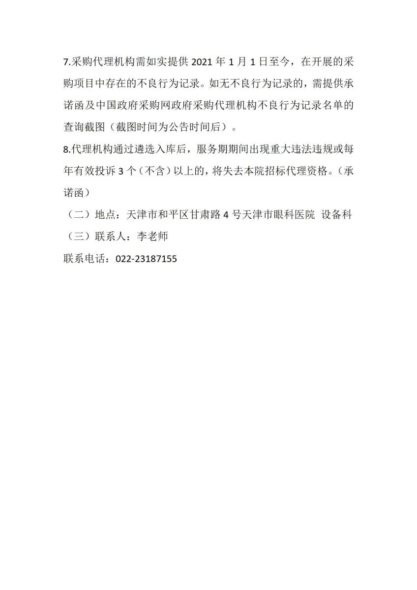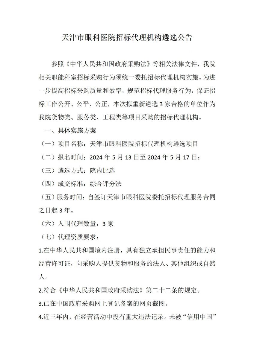 天津市眼科医院招标代理机构遴选公告
