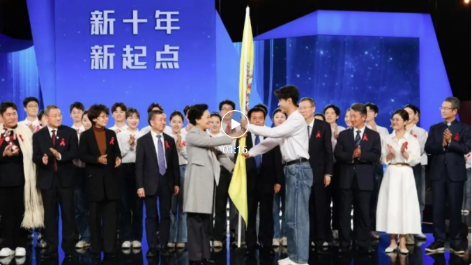 彭丽媛教授为大学生防艾志愿者代表授旗