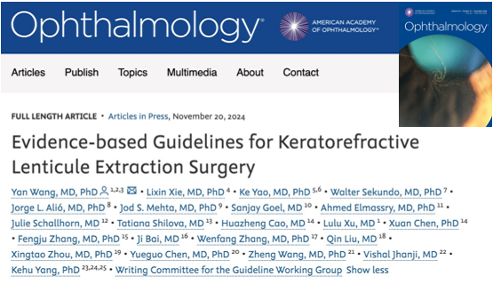 在天津市眼科医院党委和医院领导的大力支持下,历时两载,千磨万击,首部由天津市眼科医院、南开大学附属眼科医院牵头制订的国际循证医学指南“Evidence-based Guidelines for Keratorefractive Lenticule Extraction Surgery”(以下简称“指南”)在国际眼科顶刊Ophthalmology(中科院1区,Top期刊,最新IF=13.1,最高IF=14.277)在线发布,天津市眼科医院名誉院长、屈光手术知名专家王雁教授为通讯及第一作者。此为首部国人牵头并在眼科顶刊Ophthalmology上发表的国际指南。
