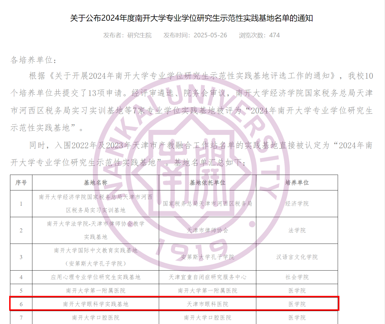 近日,我院根据《关于开展2024年南开大学专业学位研究生示范性实践基地评选工作的通知》,积极参与申报。最终,经学校评审遴选、院务会审议,我院作为“南开大学眼科学实践基地”成功获评“2024年南开大学专业学位研究生示范性实践基地”。