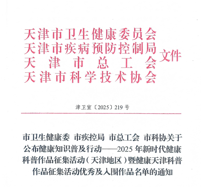 为持续推动健康知识普及,提升全民健康素养,国家卫生健康委、国家中医药局、国家疾控局、全国总工会、中国科协共同举办了健康知识普及行动——2025年新时代健康科普作品征集活动,天津市同步举办了健康知识普及行动——2025年新时代健康科普作品征集活动(天津地区)暨健康天津科普作品征集活动。在本次活动中,天津市眼科医院获评优秀组织单位,共有3件科普作品被评为入围作品。