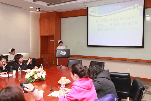 2012年12月21日下午,天津市眼科医院护理部组织了一次质控片组活动----护理部主任责任制整体护理查房(查房科室为眼肌科病区护理部)。参加此项交流活动的外院人员有:市中心妇产科医院、口腔医院、职工医院、天和医院、宁河县医院、儿童福利院等十余家医院的护理部主任及多位护士长。
