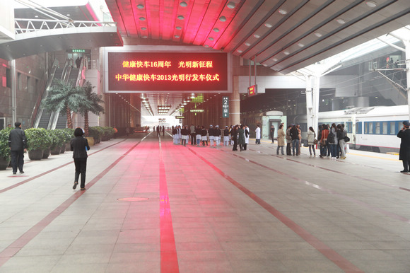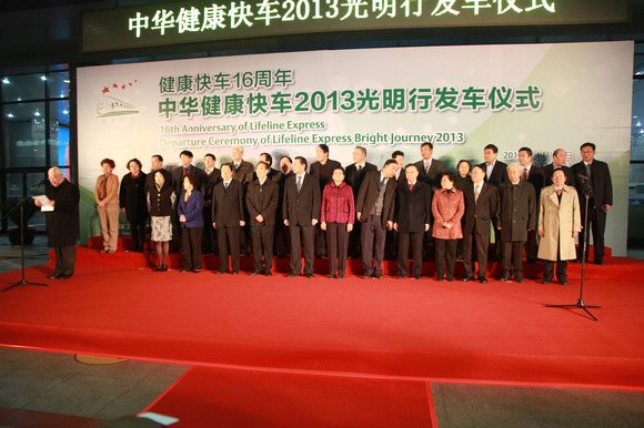 2013年4月23日,“中华健康快车2013光明行”发车仪式在北京西客站举行。第十届全国人大常委会副委员长、中国关心下一代工作委员会主任顾秀莲、国家卫生和计划生育委员会副主任马晓伟、中国铁路总公司副总经理胡亚东、中华健康快车基金会理事、来自20个国家驻华使领馆的大使和大使夫人以及天津市眼科医院、北京世纪坛医院等为代表的医护人员和长期支持健康快车工作的捐款企业代表,约200人出席了发车仪式。