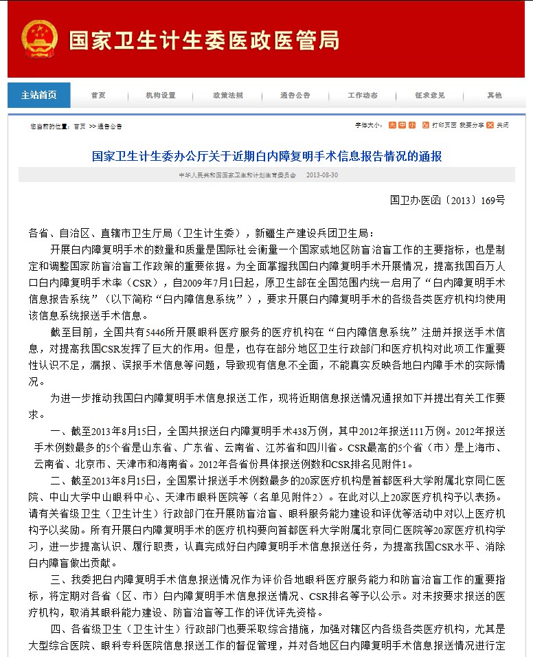 据国家卫生和计划生育委员会消息,自2009年7月1日起,原卫生部在全国范围内统一启用了“白内障复明手术信息报告系统”(以下简称“白内障信息系统”),截至2013年8月15日,全国共报送白内障复明手术438万例,其中2012年报送111万例。全国共有5446所开展眼科医疗服务的医疗机构在“白内障信息系统”注册并报送手术信息,对提高我国CSR发挥了巨大的作用。