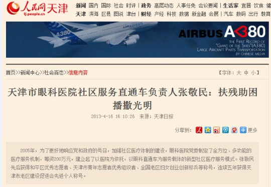 人民网天津频道:《天津市眼科医院社区服务直通车负责人张敬民:扶残助困 播撒光明》