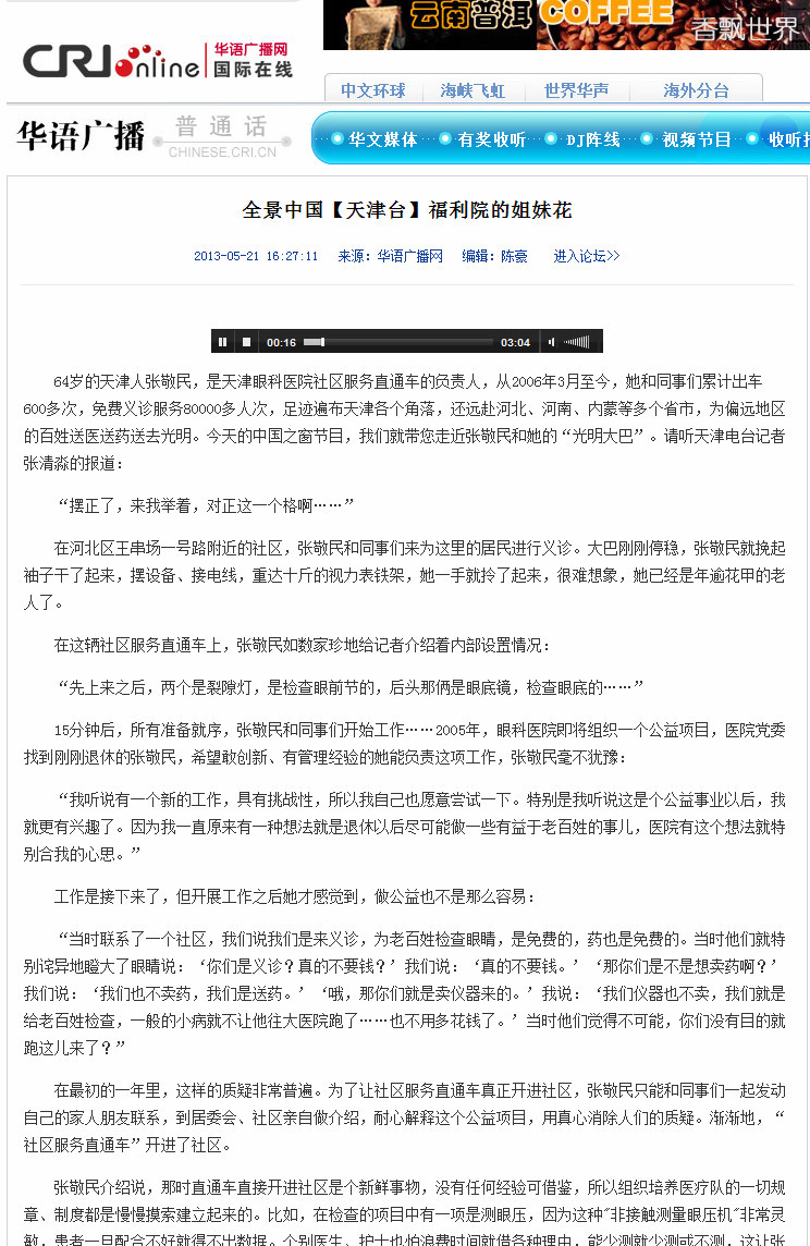 64岁的天津人张敬民,是天津眼科医院社区服务直通车的负责人,从2006年3月至今,她和同事们累计出车600多次,免费义诊服务80000多人次,足迹遍布天津各个角落,还远赴河北、河南、内蒙等多个省市,为偏远地区的百姓送医送药送去光明。今天的中国之窗节目,我们就带您走近张敬民和她的“光明大巴”。请听天津电台记者张清淼的报道: