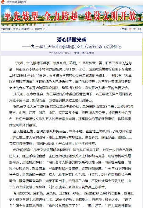 临汾新闻网:爱心播撒光明 ——九三学社天津市眼科医院支社专家在我市义诊侧记