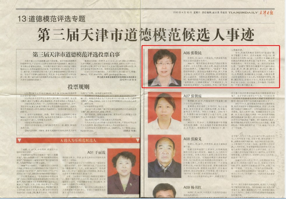 《天津日报》2013年4月10日:《第三届天津市道德模范候选人事迹》